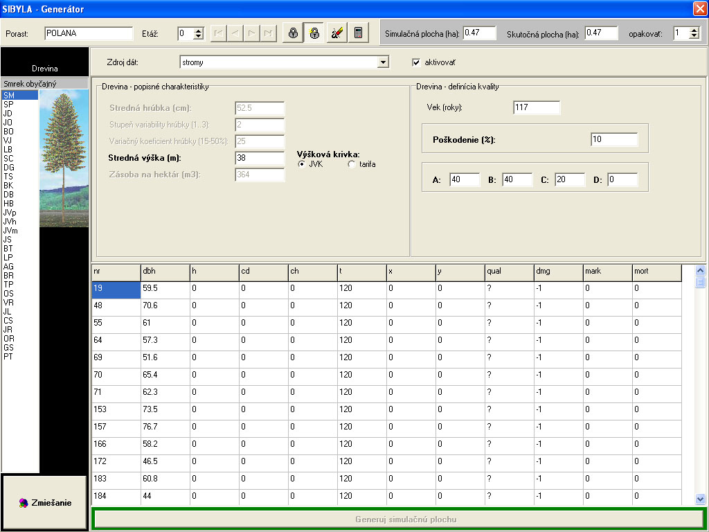 comprises tree species list of the selected forest stand. If the forest stand is locked (in "read only" mode), the list contains only tree species that occur in the stand. If the forest stand is unlocked (in write mode), the list contains all possible tree species. Moving along tree species is possible either by cursor arrows or by mouse. Tree species are specified by their Slovak abbreviations. The whole name of the selected tree species is displayed at the top of the list, while on the right side of the list, a symbolic picture of the species is shown. Below the list of tree species, the button used to define the mutual tree species mixture is situated.