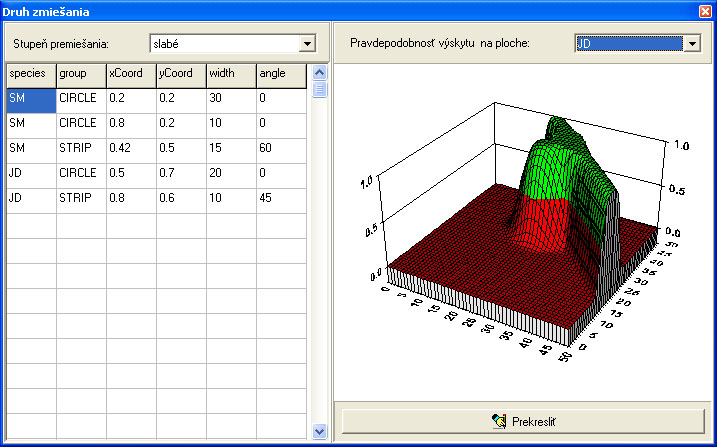 Press the button "Mixture" in the bottom part of the tree species panel ( 2 ) to open the dialogue box, in which the mixture type can be defined. The dialogue box can only be edited, if the database is open. The tree species mixture can be defined for the selected forest stand and for the selected storey. It is required to select the level of mixture and to fill in the table in the left part of the window, as it is presented in the picture below. The information to be entered is: tree species (species), type of mixture group (group), relative coordinates of the circle center or of the point in the strip (xCoord, yCoord), circle diameter or strip width in metres (width), and the angle of strip rotation in degrees (angle). These data correspond with the table MIXTURE. The tree species (species) and the type of mixture group (group) can be selected by right mouse click in the specific field. This opens the local menu with the list of tree species or groups, from which the required item can be selected. Tree species list contains abbreviations of the tree species existing in the selected forest stand and the selected storey, and the value "NONE" which specifies the place witn no trees (a clearing or a blank).The group can either be a "CIRCLE" or a "STRIP". The pictures below show the horizontal structure of the spruce-fir-beech forest stand from the example described in the section about generating stand macrostructure. The right side of the window contains the graph, on which the simulated macrostructure is displayed for the selected tree species. To display another tree species, select it from the list in the menu "Probability of appearance on the plot", and update the graph by pressing the button "Repaint". The following three pictures present the occurrence probability of individual tree species in the stand in the order: spruce, fir, and beech. The fourth picture shows the final generated horizontal structure.