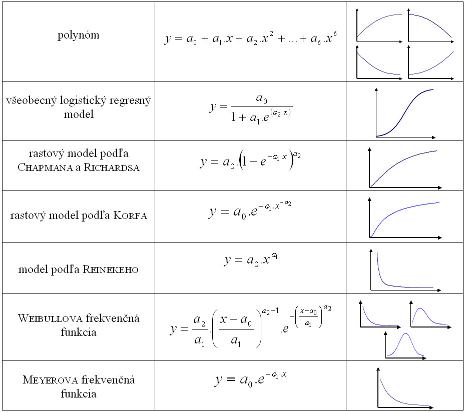 The algorithm that determines the amount of trees to be removed or to be supported differs depending on the treatment variant. The model offers the following variants: Thinning percentage represents the relative amount of felled volume in per cents. It can be either static, i.e. given for a particular simulation period, or dynamic, i.e. modelled in relation to the value of the chosen growth variable x (age, mean diameter, mean height, top height). In order to model dynamic thinning percentage, a suitable function chosen from the model menu (Table 1) can be utilised: %VP = Additivity + f(x) . Multiplier where Additivity is a constant (by default 0), and Multiplier is an index (by default 1). The additivity and multiplier move the function along the axis y in absolute or relative values according to the requirements. The final volume of the secondary crop is calculated from the initial volume of the dominant crop as follows: VP = VZ . %VP : 100 By default, the growth simulator SIBYLA applies the model of decennial thinning percentage of Halaj et al. (1986), in which the percentage is related to stand age of all modelled tree species, site classes, and degrees of stand density. Table 1 Menu of mathematical functions f(x) in SIBYLA