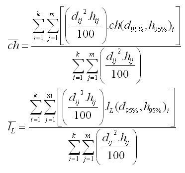 where dij and hij are tree diameters and heights, respectively, k is the number of tree species in the stand, m is the number of trees of a particular tree species, and ch(95%)i and lL(95%)i are the modelled height to crown base and modelled length of the sunlit part of the crown, respectively, simulated for the tree of the particular tree species having the top height and the top diameter. The final classification of the tree follows the classification formula: